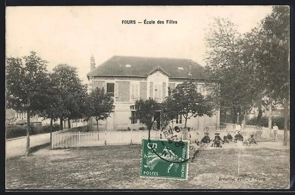 AK Fours, École des Filles avec jardin et élèves assis à l`extérieur