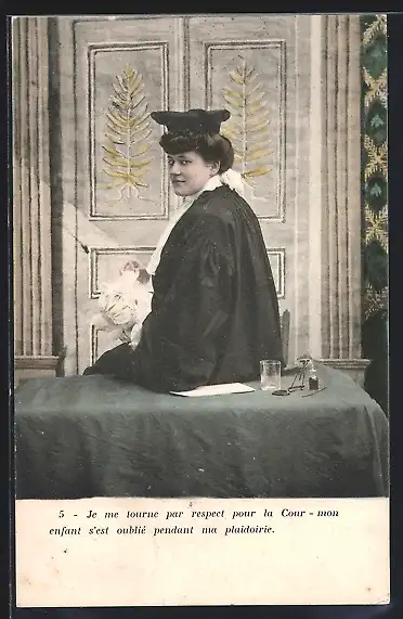 AK Fräulein in Richterrobe auf einem Tisch sitzend