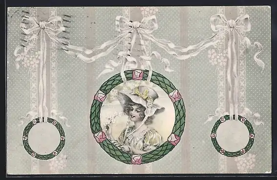 AK Fräulein mit Hut im Kranz mit Schleifen