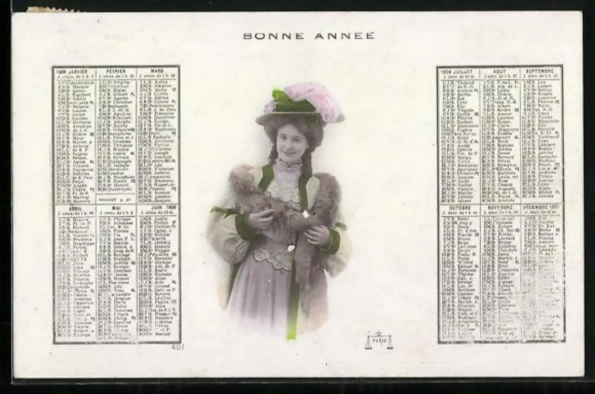 AK Fräulein mit einem Kalender, Neujahrsgruss