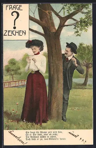 AK Fragezeichen, Frau fragt eine Blume nach der Liebe ihres Verehrers