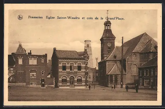 AK Frameries, Eglise Sainte-Waudru et coin de la Grand`Place