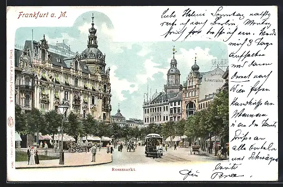 AK Frankfurt /Main, Rossmarkt mit Strassenbahn und Geschäften, Pferdebahn