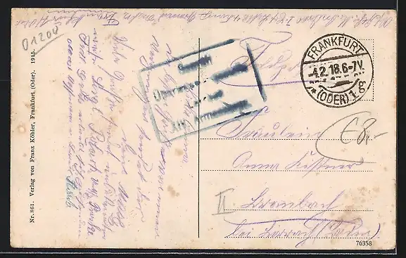 alte Ansichtskarte, gelaufen 1918 als Feldpost, Eckknick rechts unten, guter Zustand