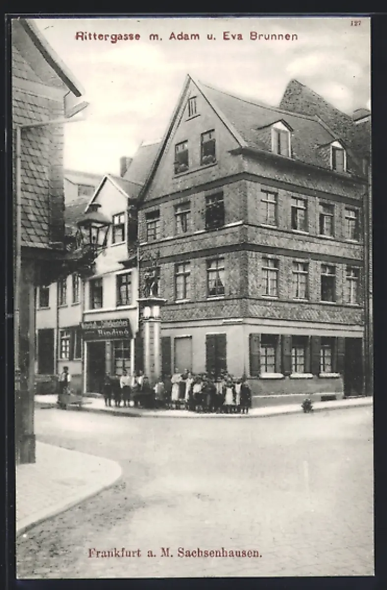 AK Frankfurt-Sachenhausen, Rittergasse mit Adam u. Eva Brunnen