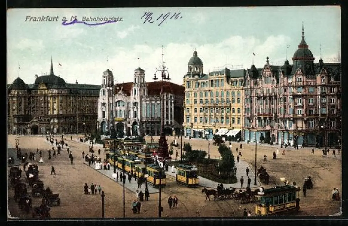 AK Frankfurt a. M., Bahnhofsplatz mit Café und Strassenbahn