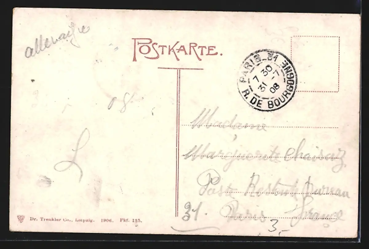 Personenbezogene Daten auf der Rückseite der Karte wurden durch blauen Textmarker unkenntlich gemacht. Die blauen Stellen sind auf die Vorderseite durchgeweicht und wirken sich negativ auf das Postkartenfoto aus