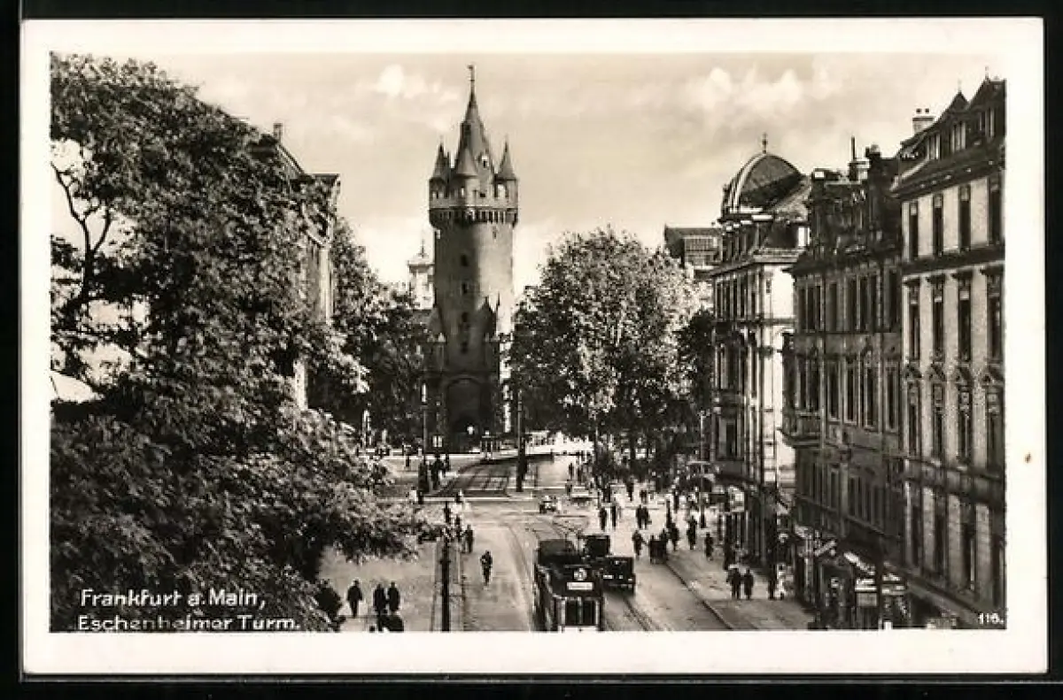 AK Frankfurt a. M., Eschenheimer Turm mit Strassenbahn