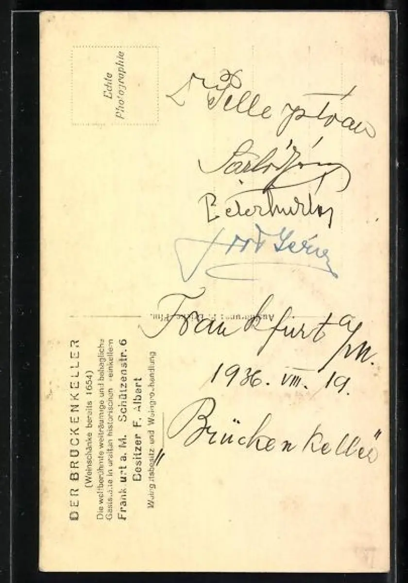 Personenbezogene Daten auf der Rückseite der Karte wurden durch blauen Textmarker unkenntlich gemacht. Die blauen Stellen sind auf die Vorderseite durchgeweicht und wirken sich negativ auf das Postkartenfoto aus
