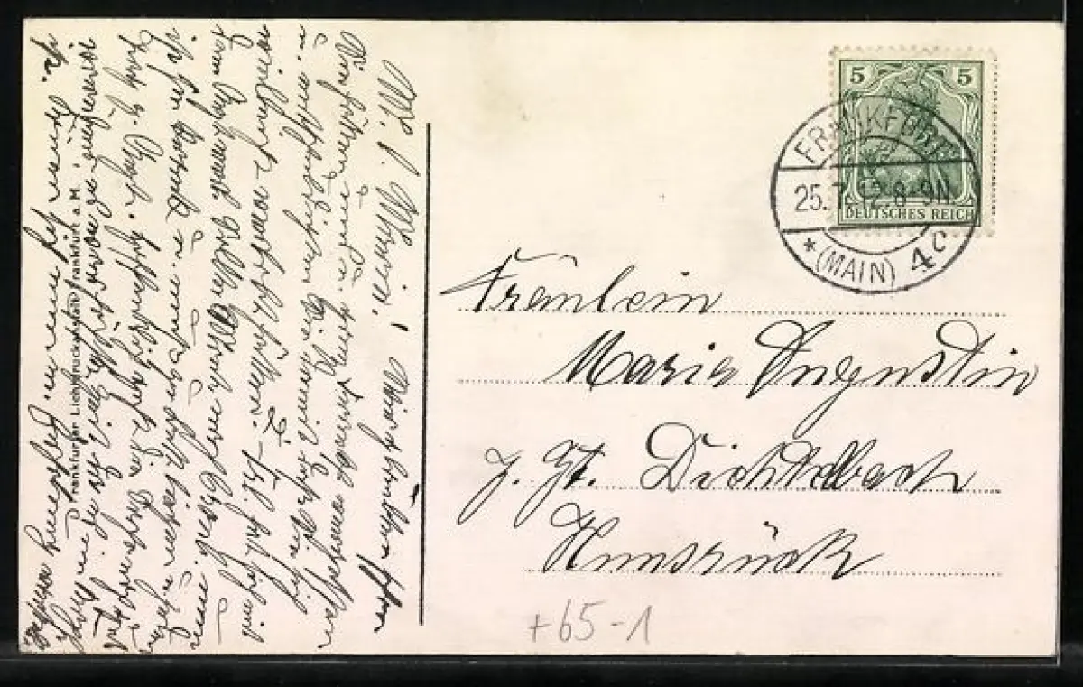 Personenbezogene Daten auf der Rückseite der Karte wurden durch blauen Textmarker unkenntlich gemacht. Die blauen Stellen sind auf die Vorderseite durchgeweicht und wirken sich negativ auf das Postkartenfoto aus