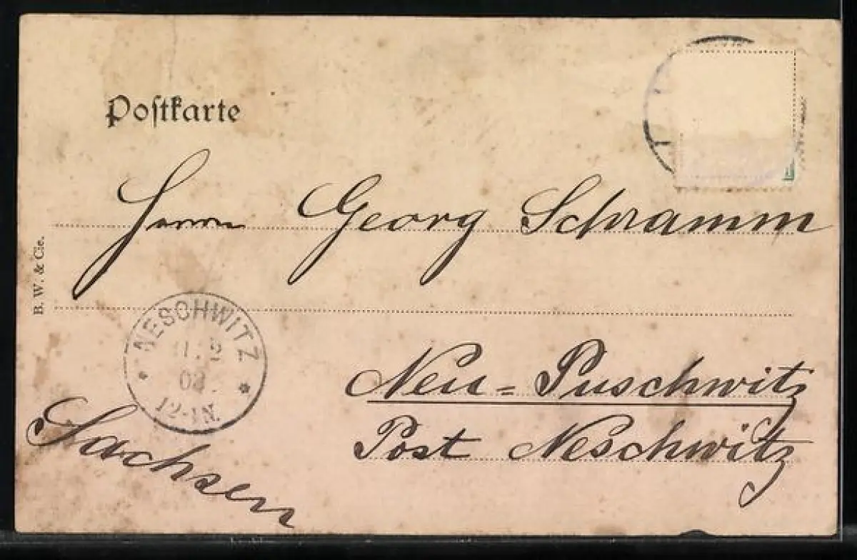 alte Ansichtskarte, gelaufen 1903, Briefmarke entfernt, rückseitig Oberflächenschaden, Eckknick li. oben, Kanten bestoßen, guter Zustand