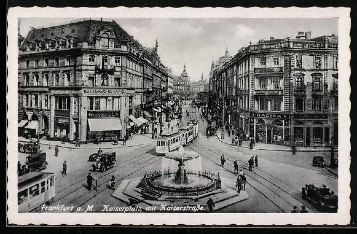 AK Frankfurt a. M., Kaiserplatz und Kaiserstrasse mit Geschäften, Strassenbahn