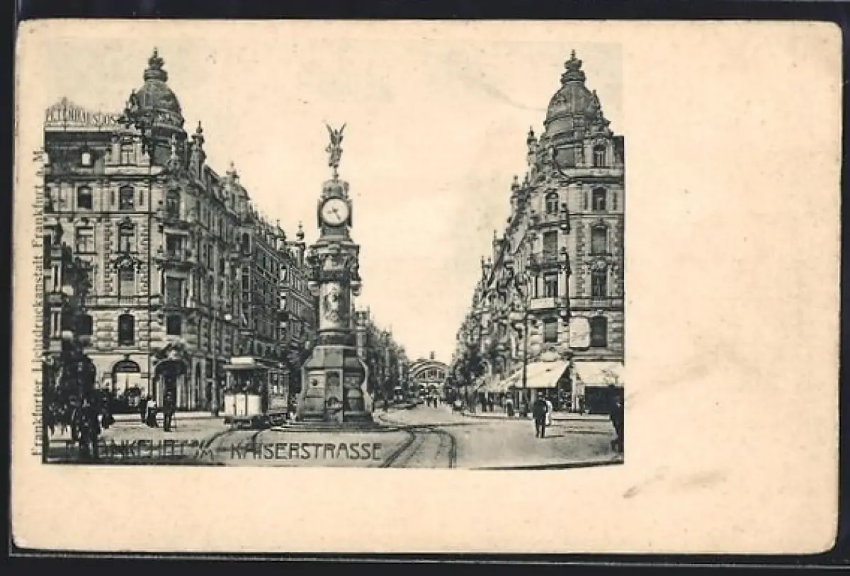 AK Frankfurt a. M., Kaiserstrasse, Strassenpartie mit Strassenbahn u. Uhrensäule