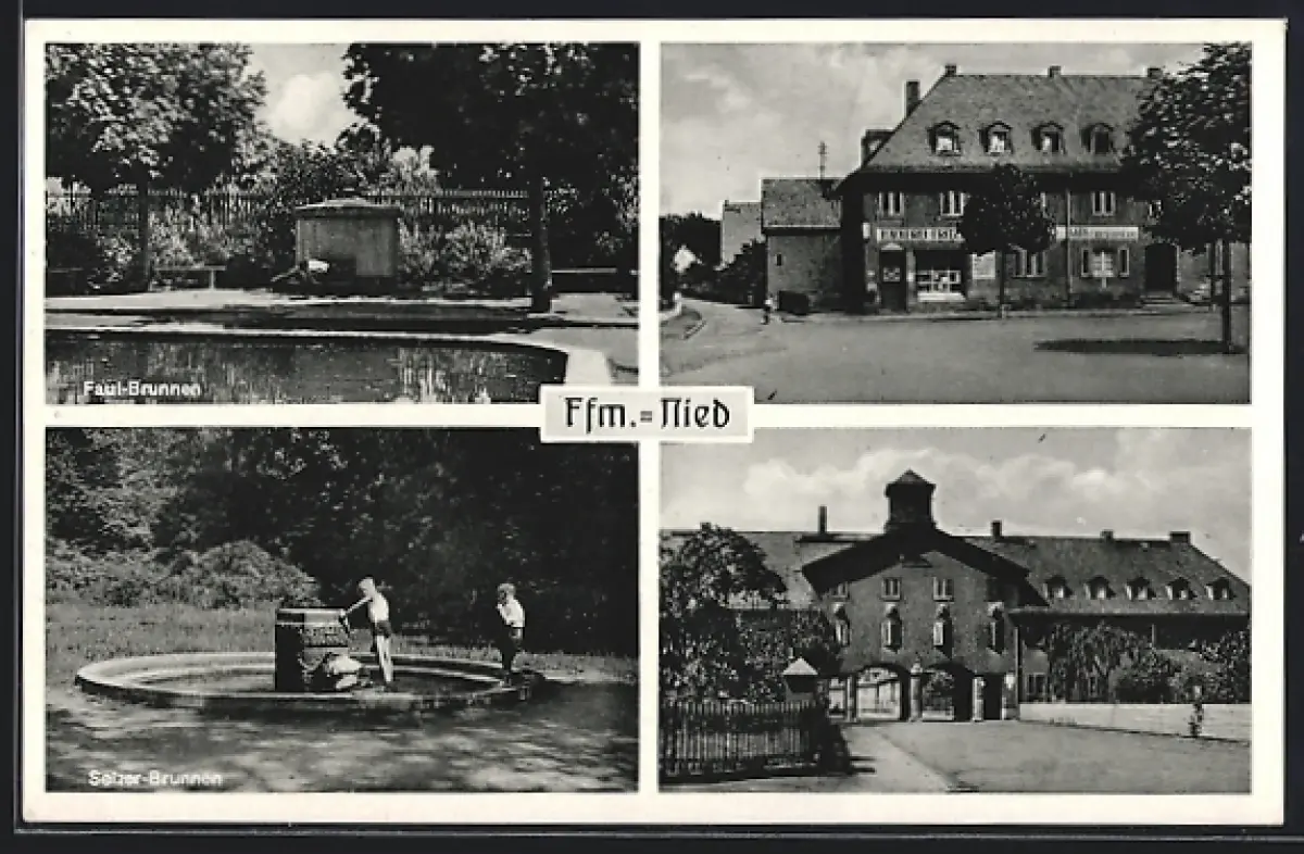 AK Frankfurt a. M.-Nied, Faul-Brunnen, Selzer-Brunnen und Strassenpartien