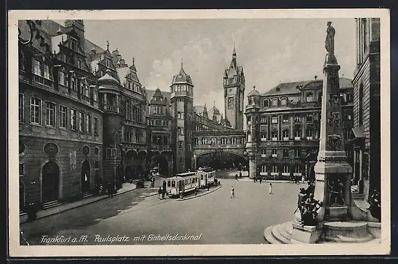 AK Frankfurt a. M., Paulsplatz mit Einheitsdenkmal und Strassenbahn