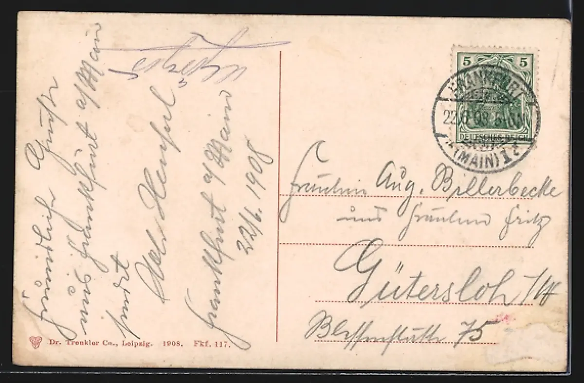 gelaufen 1908, rückseitig Klebe- und Papierreste, rückseitig Oberflächenschaden, guter Zustand