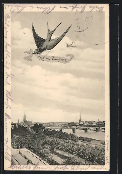 AK Frankfurt a. M., Schwalben fliegen über die Brücke der Stadt
