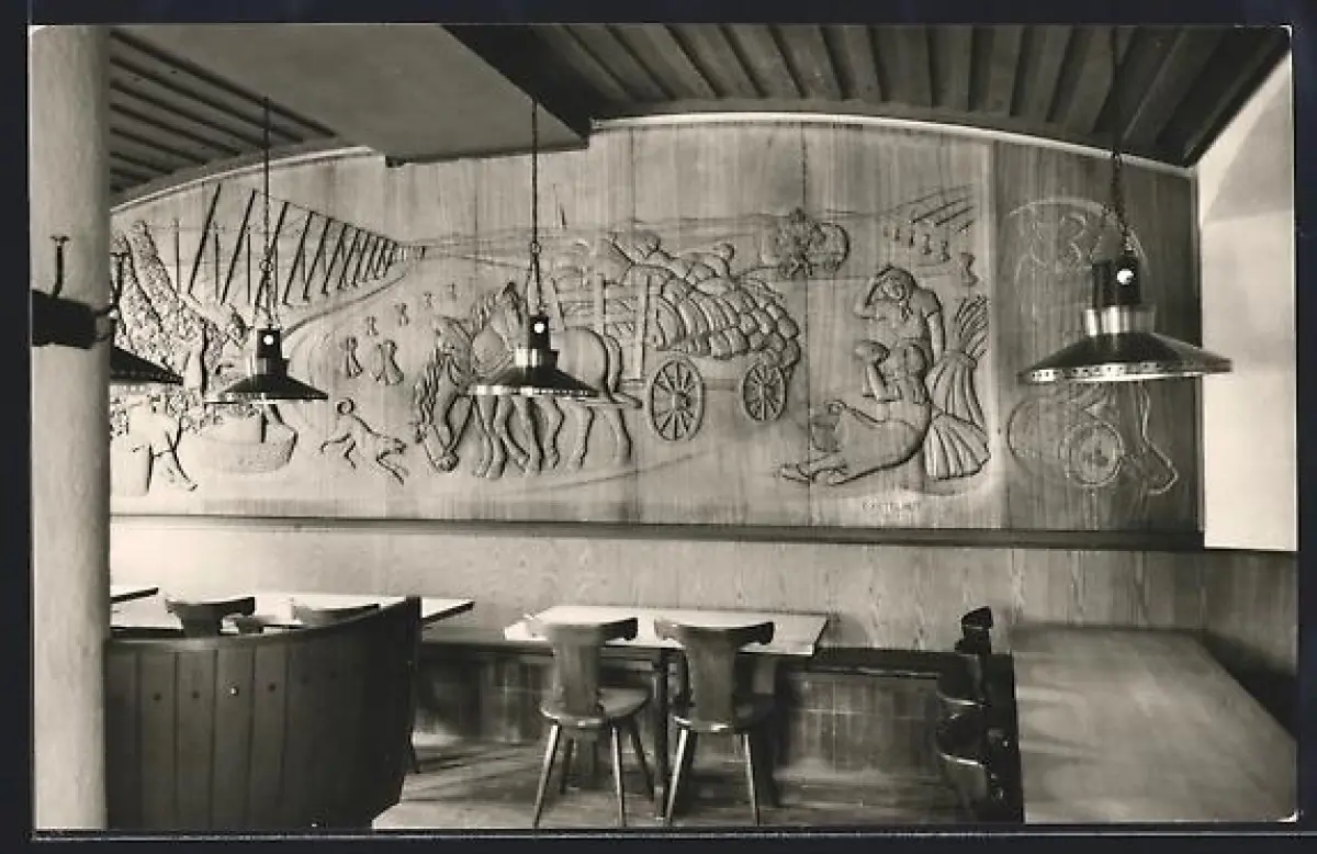 AK Frankfurt a. M., Turmschänke mit Holzschnitt an der Wand