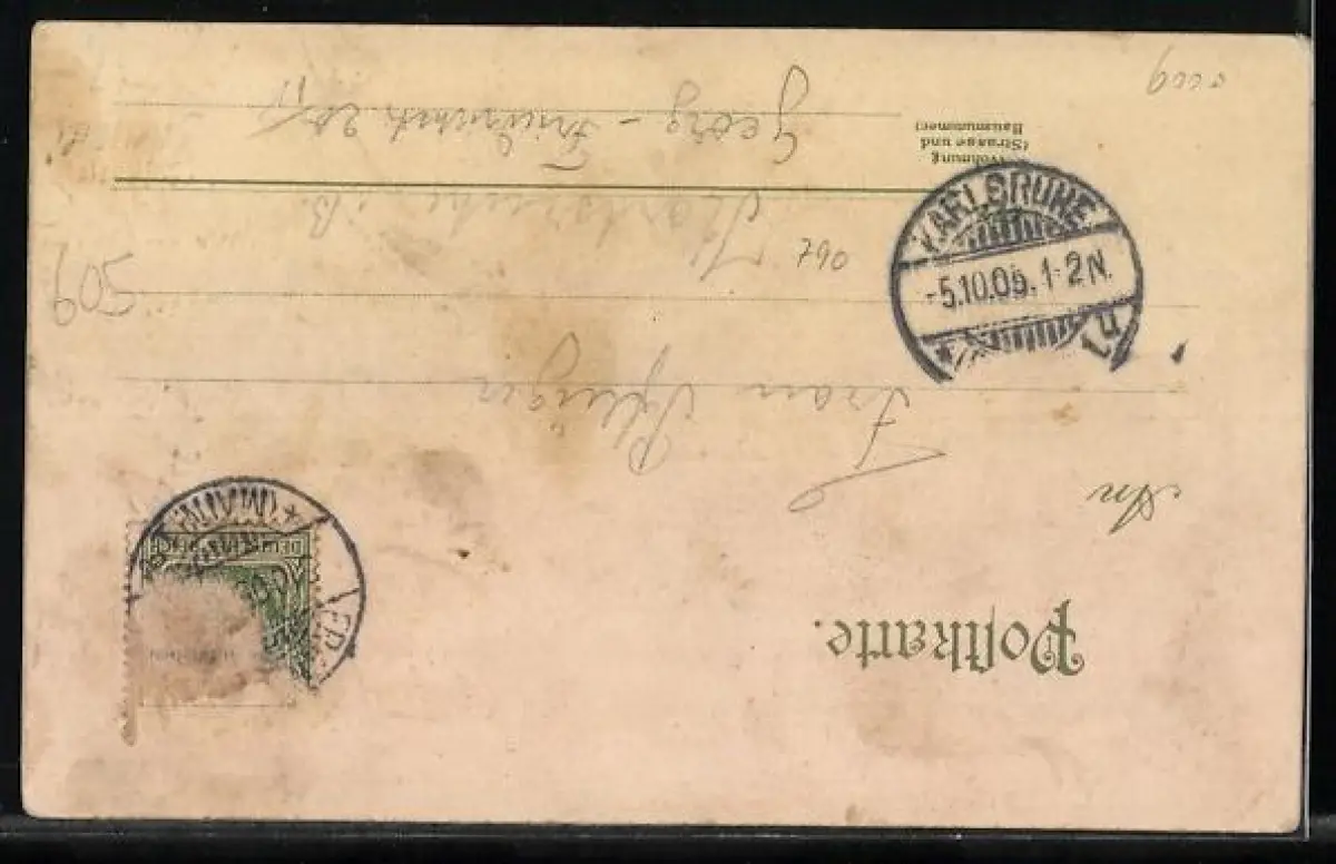 Personenbezogene Daten auf der Rückseite der Karte wurden durch blauen Textmarker unkenntlich gemacht. Die blauen Stellen sind auf die Vorderseite durchgeweicht und wirken sich negativ auf das Postkartenfoto aus