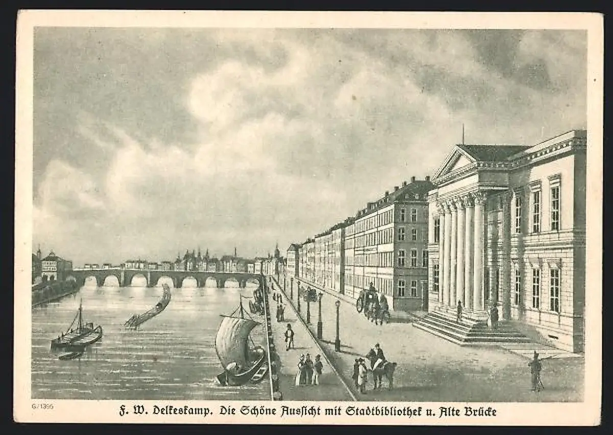 AK Frankfurt a.M., Partie im Ort mit Stadtbibliothek und Alter Brücke, Segelschiffe