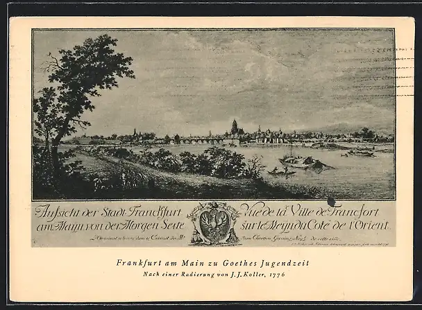 AK Frankfurt am Main, Ansicht der Stadt zu Goethes Jugendzeit, Radierung von 1776