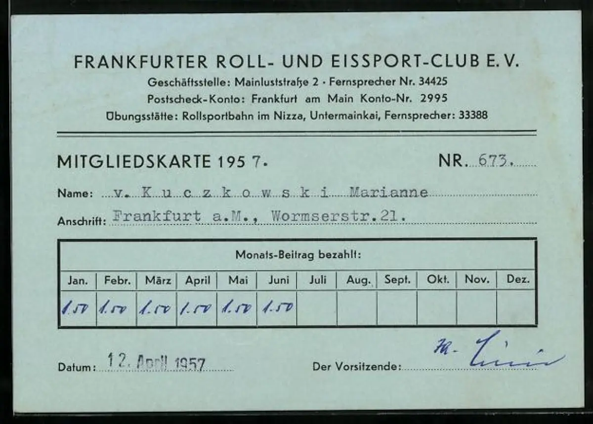 AK Frankfurt am Main, Mitgliedskarte Nr. 673 des Frankfurter Roll- und Eissport-Clubs e.V., 1957, Untermainkai