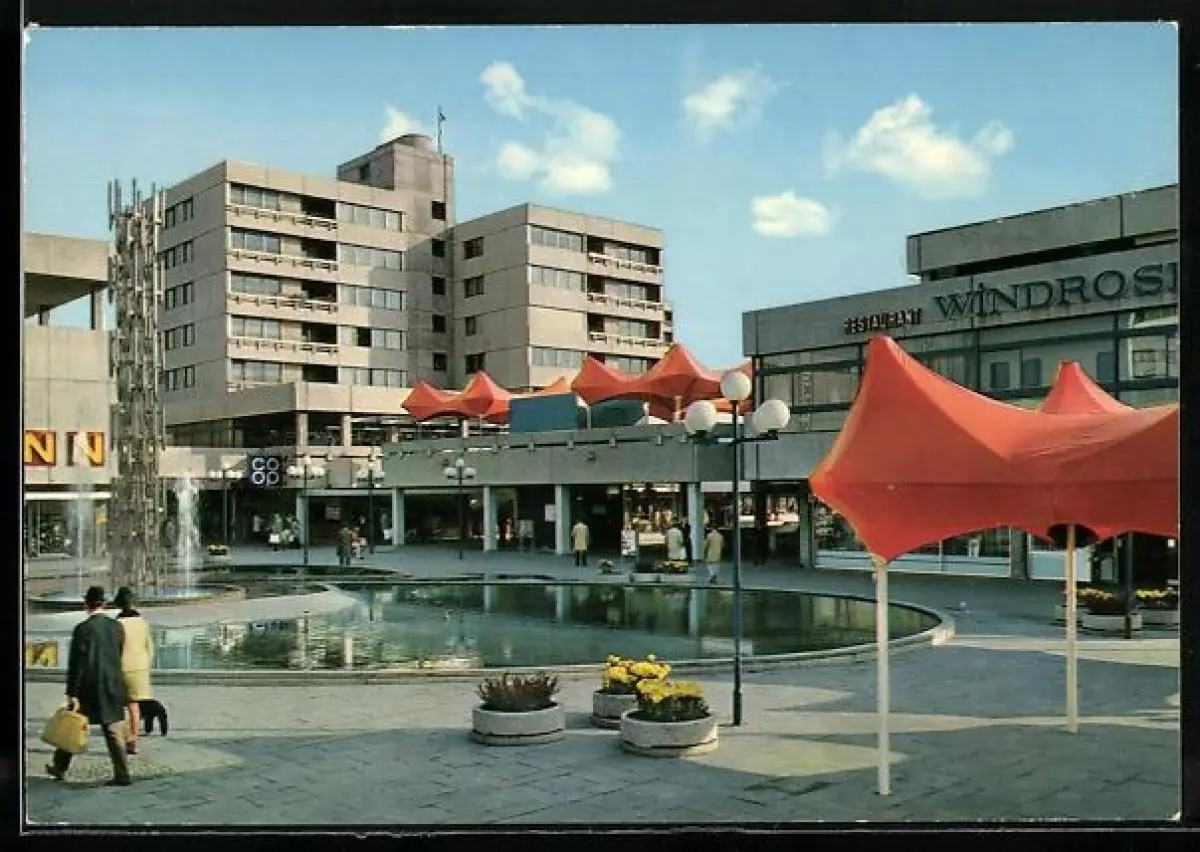 AK Frankfurt am Main, Nordwest-Stadt, Einkaufszentrum, Restaurant Windrose, Brunnen mit Fontäne