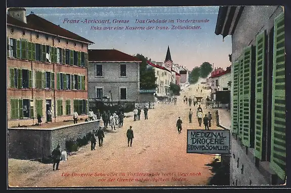 AK Franz.-Avricourt, Drogerie Schwaller, Gebäude im Vordergrunde, links war eine Kaserne der franz. Zollwächter, Grenze