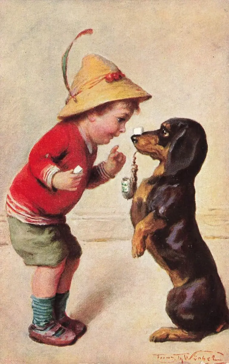 AK Franz Würbel Dackel sitzt Männchen mit Pfeife Bube mit Strohhut Künstlerkarte