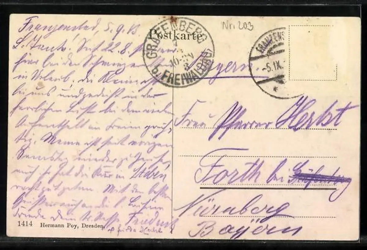 Personenbezogene Daten auf der Rückseite der Karte wurden durch blauen Textmarker unkenntlich gemacht. Die blauen Stellen sind auf die Vorderseite durchgeweicht und wirken sich negativ auf das Postkartenfoto aus