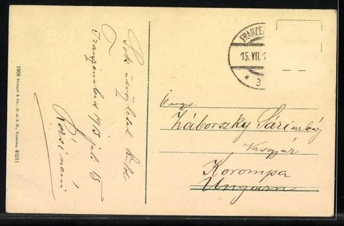 Personenbezogene Daten auf der Rückseite der Karte wurden durch blauen Textmarker unkenntlich gemacht. Die blauen Stellen sind auf die Vorderseite durchgeweicht und wirken sich negativ auf das Postkartenfoto aus