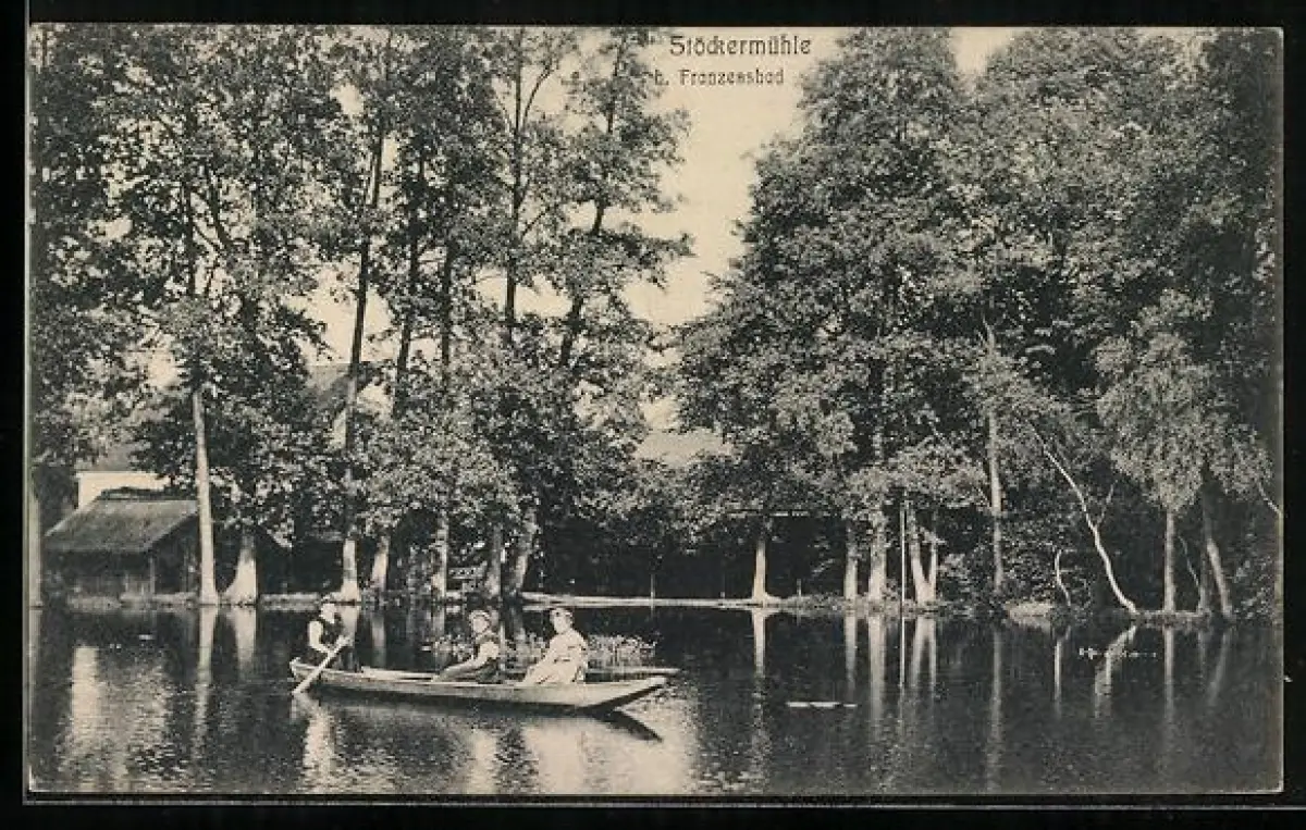 AK Franzensbad, Stöckermühle, Urlauber auf Ruderboot