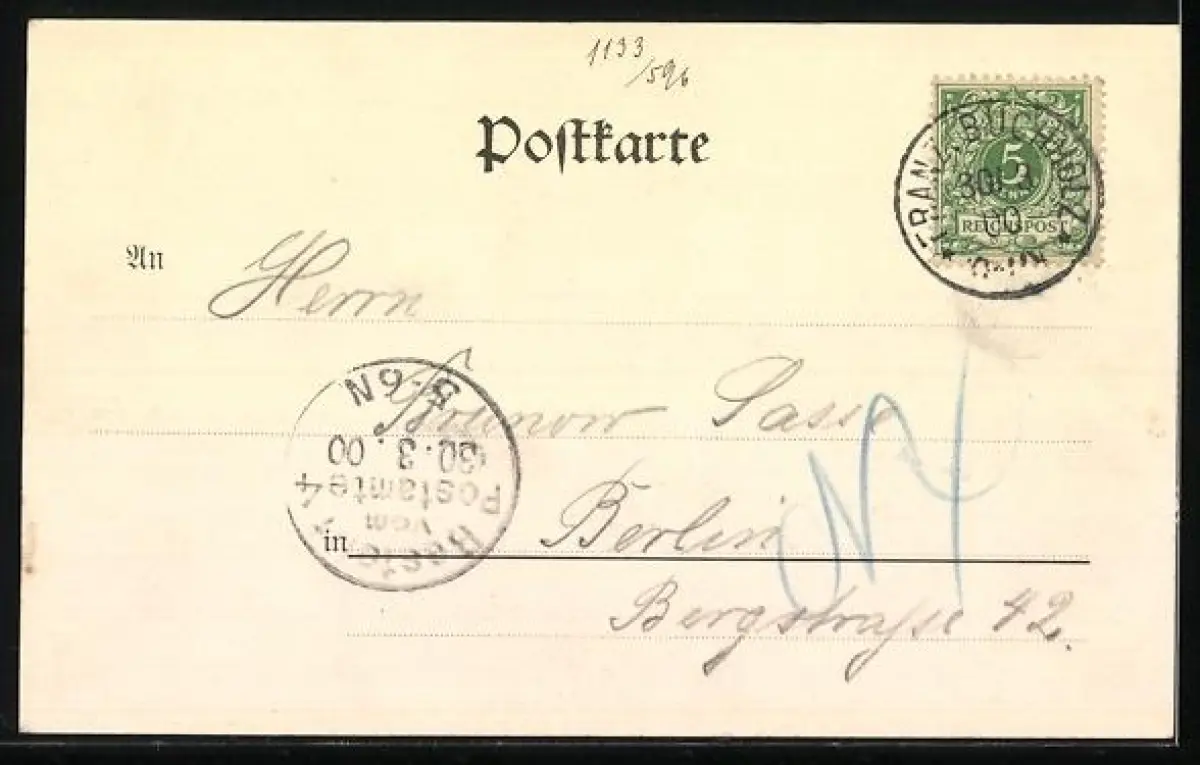 alte Ansichtskarte, gelaufen 1900, Stempeldurchbruch mitte