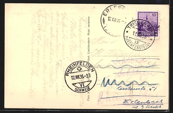 Personenbezogene Daten auf der Rückseite der Karte wurden durch blauen Textmarker unkenntlich gemacht. Die blauen Stellen sind auf die Vorderseite durchgeweicht und wirken sich negativ auf das Postkartenfoto aus