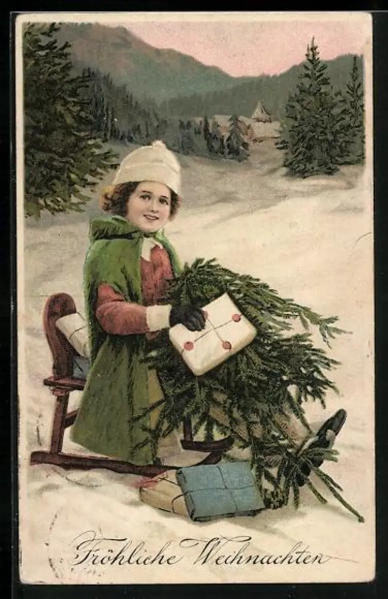 AK Frau auf Schlitten mit Weihnachtsgrüssen