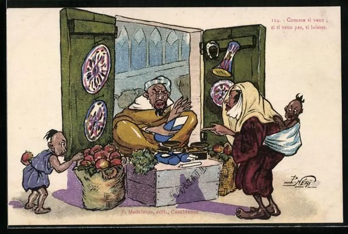 AK Frau bei arabischem Markthändler, Kolonialhumor