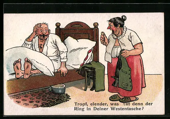 AK Frau findet Ring in der Westentasche des Mannes, frauenfeindlicher Humor