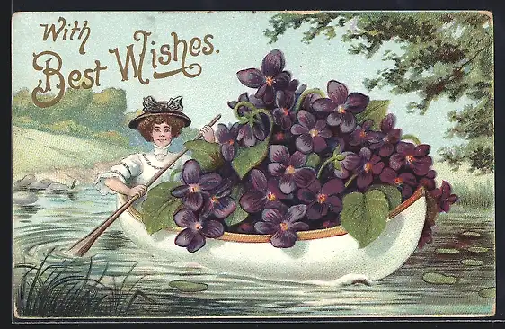 AK Frau im Boot mit einem Haufen Veilchen, Rudern