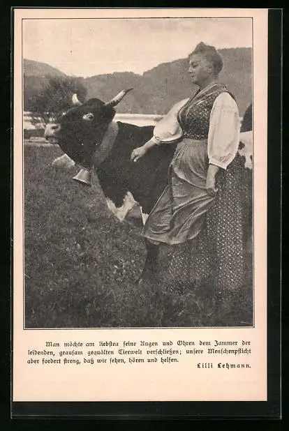 AK Frau im Dirndl mit Kuh, Zitat Lilli Lehmann