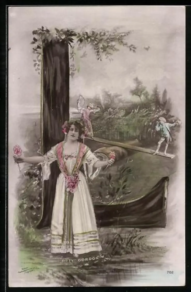 AK Frau im Kleid am Buchstaben L, Im Hintergrund Kinder auf Wippe