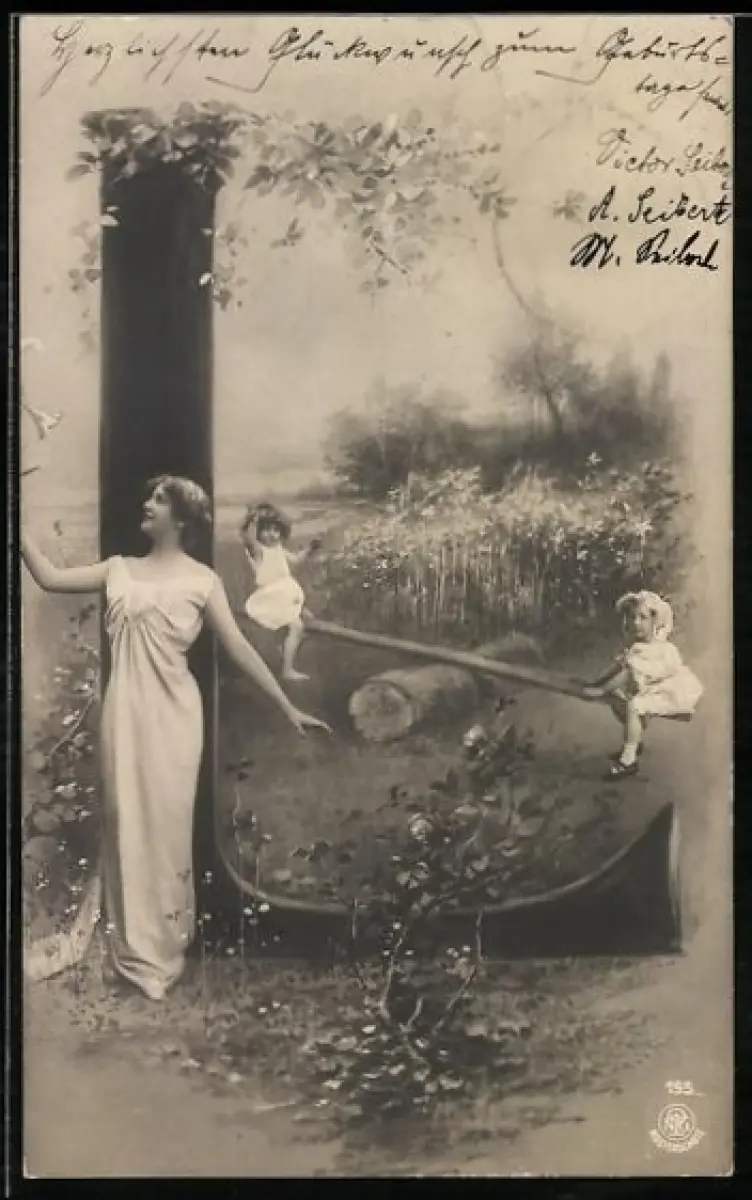 AK Frau im Kleid am Buchstaben L, Im Hintergrund Kinder auf Wippe