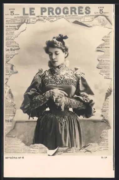 AK Frau im Kleid durch zerrissene Zeitung Le Progres