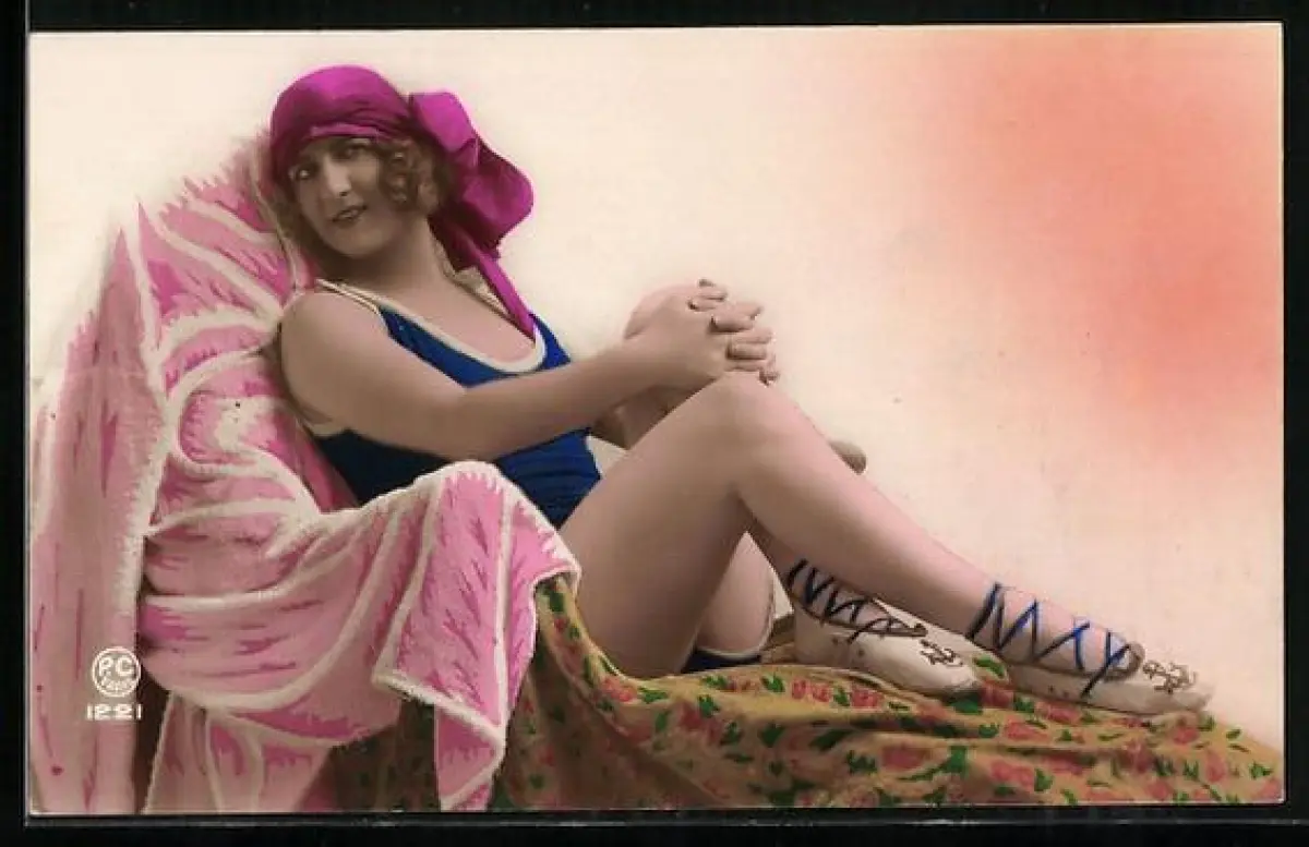 AK Frau im blauen Badeanzug mit Tanzschuhen
