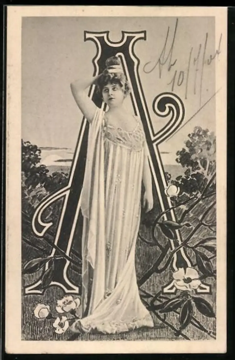 AK Frau im langen Kleid am Buchstaben A