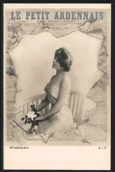 AK Frau im weissen Kleid durch zerrissene Zeitung Le Petit Ardennais