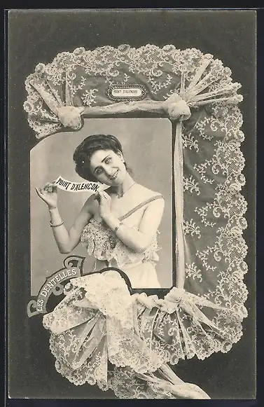 AK Frau im weissen Kleid im Rahmen aus geklöppelter Spitze