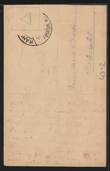 Personenbezogene Daten auf der Rückseite der Karte wurden durch blauen Textmarker unkenntlich gemacht. Die blauen Stellen sind auf die Vorderseite durchgeweicht und wirken sich negativ auf das Postkartenfoto aus