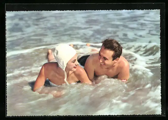 AK Frau in Bikini liegt nebst Mann in Badehose im Wasser