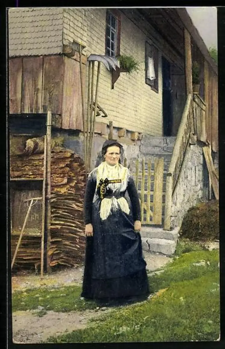 AK Frau in Schwarzwälder Tracht vor einem Haus