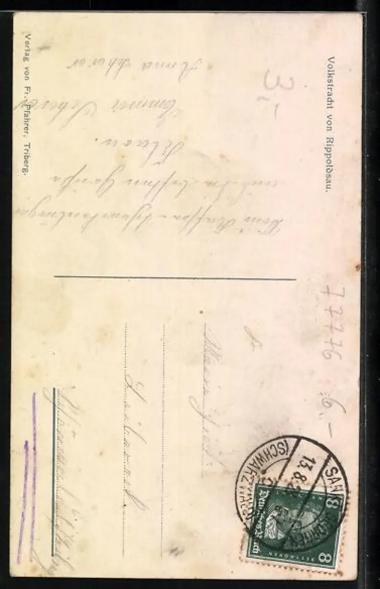 Personenbezogene Daten auf der Rückseite der Karte wurden durch blauen Textmarker unkenntlich gemacht. Die blauen Stellen sind auf die Vorderseite durchgeweicht und wirken sich negativ auf das Postkartenfoto aus